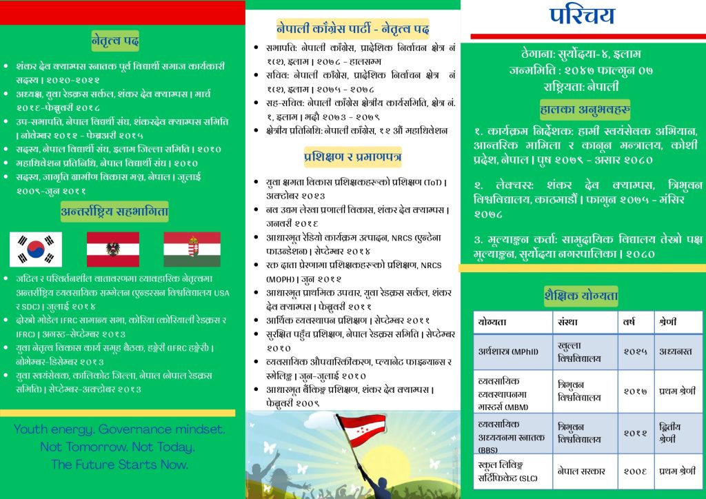I am Nishcal Rai, contesting for Ilam-1 in the Federal Parliament. Having walked every village-from Sandakpur to Mai-I have seen both the challenges and possibilities in our farms, tea gardens, milk sector, tourism, education, small businesses and so on. I am committed and eager to transform these possibilities into real opportunities, creating economies, and building a livable, sustainable Ilam.